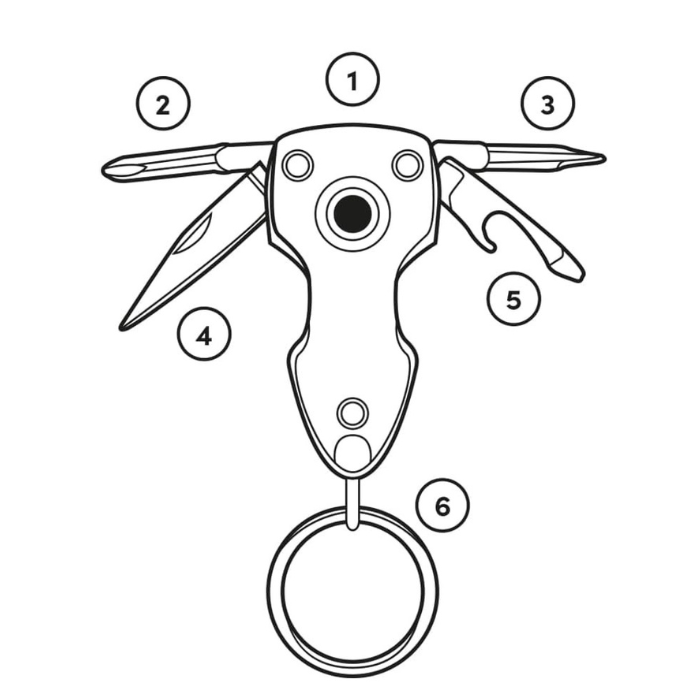 Portachiavi multifunzione compatto e resistente, perfetto da portare sempre con sé in tasca, nello zaino o come accessorio di uso quotidiano. Integra 6 funzioni essenziali in un unico gadget tascabile: luce LED, coltellino, cacciavite a stella, cacciavite piatto, apribottiglie e anello portachiavi.
